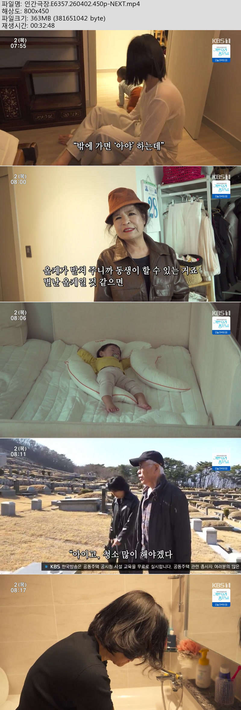 방송/동영상 인간극장 E6357 NEXT 인간극장.E6357.260402.450p-NEXT 내사랑비타민 2026.04.24 4,056 364.0M 다운로드 1개 파일 인간극장.E6357.260402.450p-NEXT.mp4 364.0M 다운 추천 394 북마크 공유 목록 Tags 인간극장 E6357 NEXT