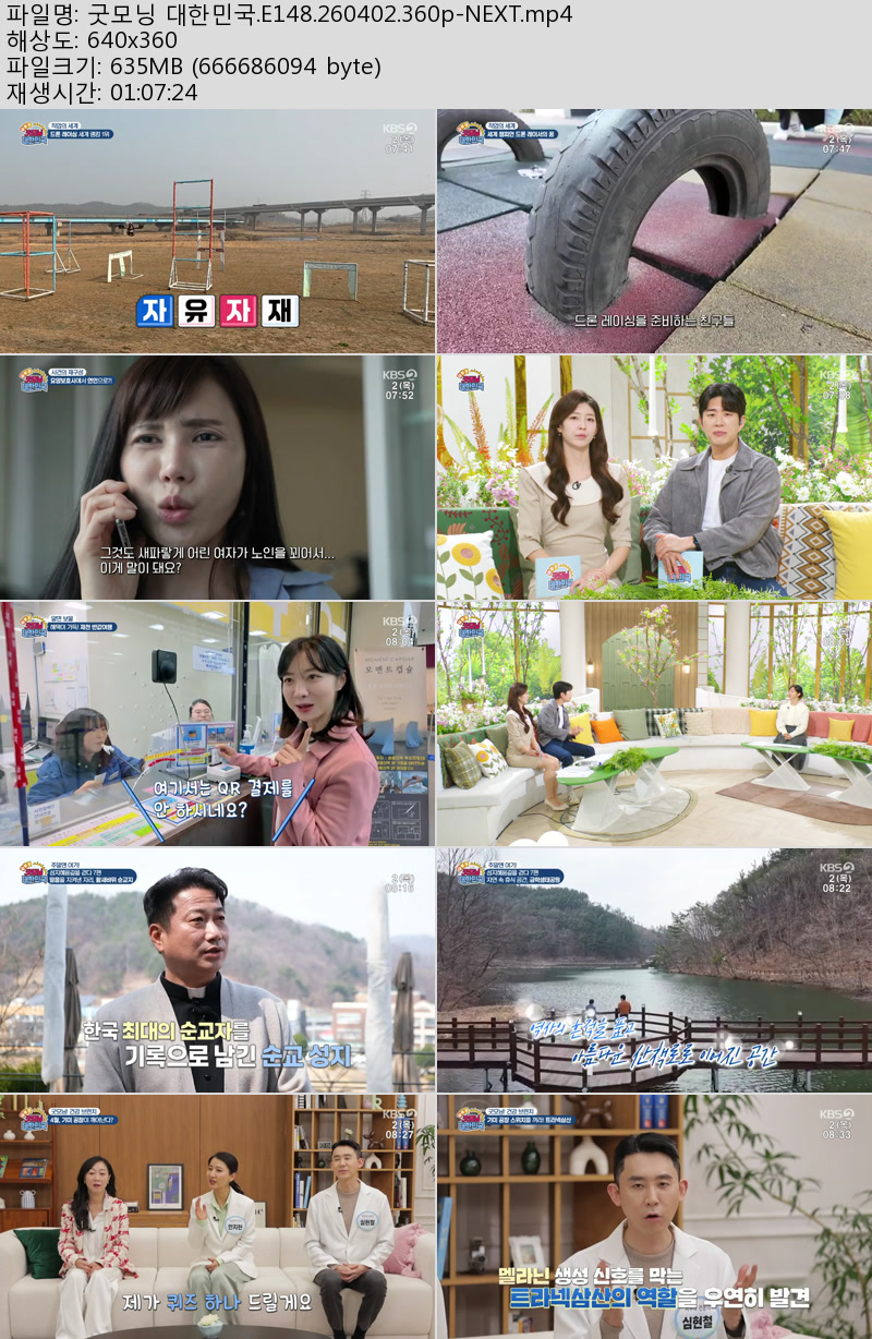 방송/동영상 굿모닝 대한민국 E148 굿모닝 대한민국.E148.260402.360p-NEXT 우야쓰꼬 2026.04.24 6,647 635.8M 다운로드 1개 파일 굿모닝 대한민국.E148.260402.360p-NEXT.mp4 635.8M 다운 추천 205 북마크 공유 목록 Tags 굿모닝 대한민국 E148 NEXT