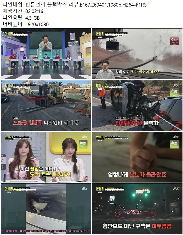 방송/동영상 한문철의 블랙박스 리뷰 한문철의 블랙박스 리뷰.E167.260401.1080p.H264 디스사랑 2026.04.24 7,759 4.3G 다운로드 1개 파일 한문철의 블랙박스 리뷰.E167.260401.1080p.H264-F1RST.mp4 4.3G 다운 추천 233 북마크 공유 목록 Tags 한문철의 블랙박스 리뷰 E167 H264