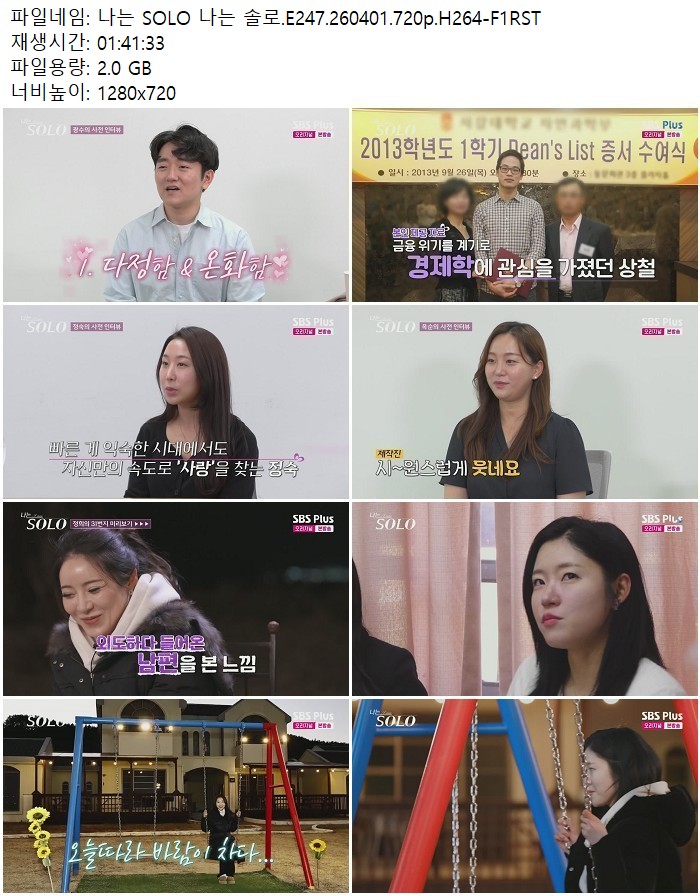 방송/동영상 나는 SOLO 솔로 나는 SOLO 나는 솔로.E247.260401.720p.H264 디스사랑 2026.04.24 4,905 2.0G 다운로드 1개 파일 나는 SOLO 나는 솔로.E247.260401.720p.H264-F1RST.mp4 2.0G 다운 추천 221 북마크 공유 목록 Tags 나는 SOLO 솔로 E247 H264
