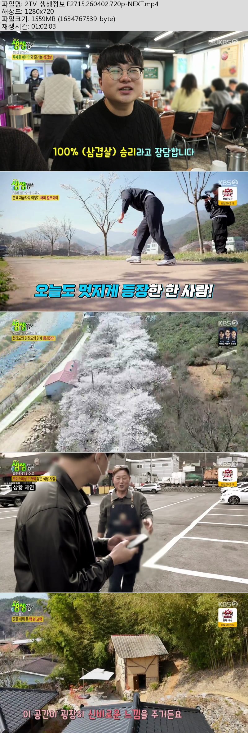방송/동영상 2TV 생생정보 E2715 2TV 생생정보.E2715.260402.720p-NEXT 방송다좋아 2026.04.24 3,553 1.5G 다운로드 1개 파일 2TV 생생정보.E2715.260402.720p-NEXT.mp4 1.5G 다운 추천 466 북마크 공유 목록 Tags 2TV 생생정보 E2715 NEXT