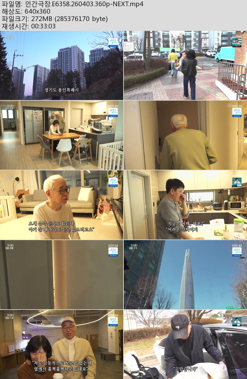 방송/동영상 인간극장 E6358 NEXT 인간극장.E6358.260403.360p-NEXT 우야쓰꼬 2026.04.24 7,792 272.2M 다운로드 1개 파일 인간극장.E6358.260403.360p-NEXT.mp4 272.2M 다운 추천 218 북마크 공유 목록 Tags 인간극장 E6358 NEXT