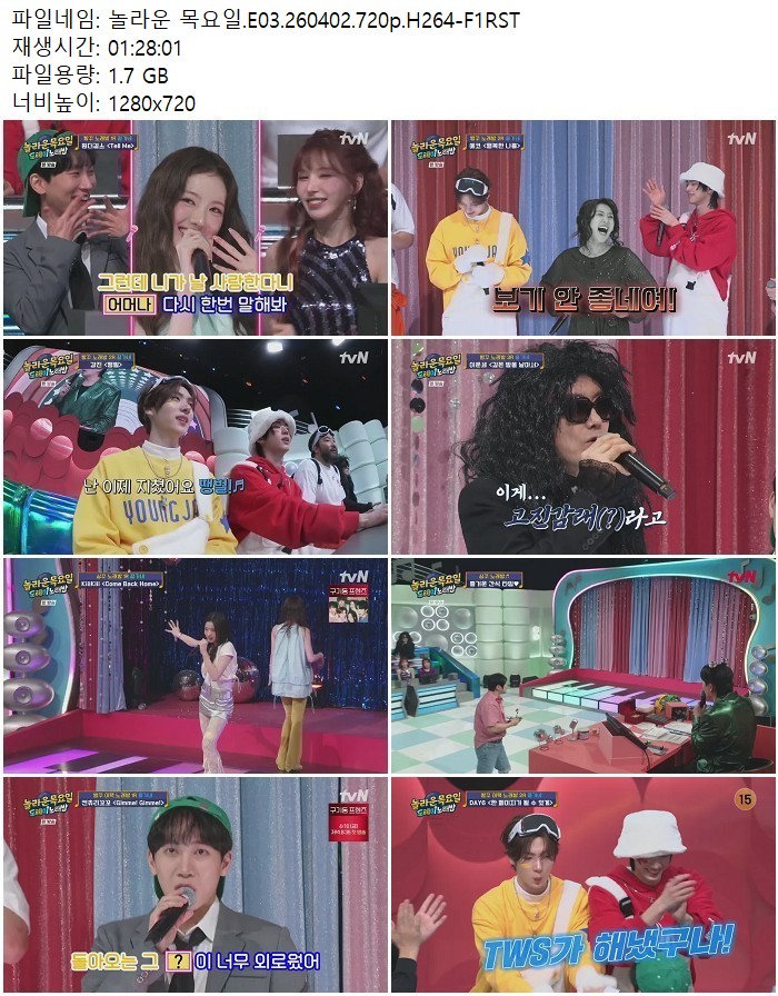 방송/동영상 놀라운 목요일 E03 놀라운 목요일.E03.260402.720p.H264 디스사랑 2026.04.24 6,260 1.7G 다운로드 1개 파일 놀라운 목요일.E03.260402.720p.H264-F1RST.mp4 1.7G 다운 추천 260 북마크 공유 목록 Tags 놀라운 목요일 E03 H264 F1RST