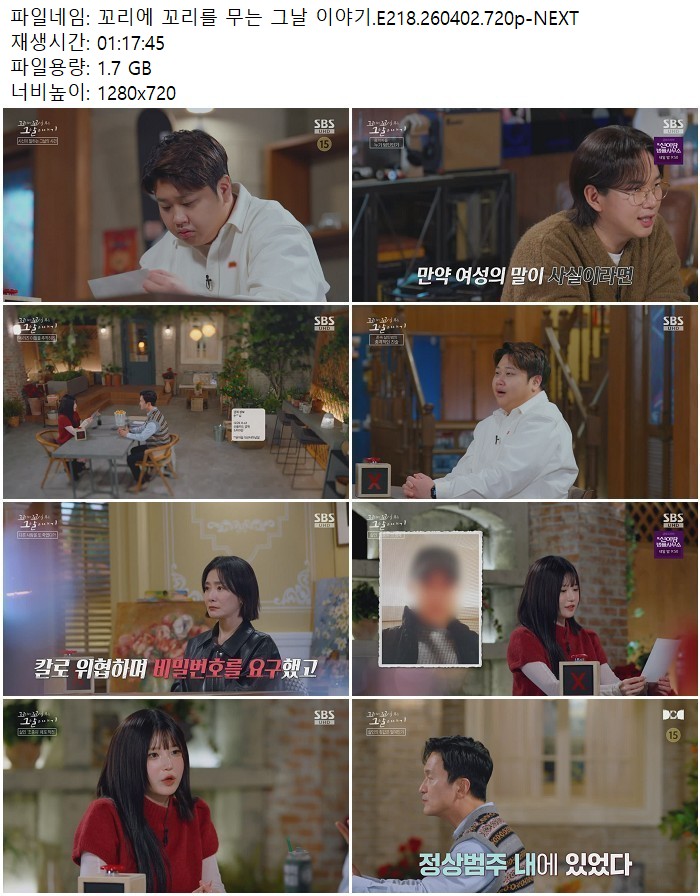 방송/동영상 꼬리에 꼬리를 무는 꼬리에 꼬리를 무는 그날 이야기.E218.260402.720p-NEXT 디스사랑 2026.04.24 6,588 1.7G 다운로드 1개 파일 꼬리에 꼬리를 무는 그날 이야기.E218.260402.720p-NEXT.mp4 1.7G 다운 추천 469 북마크 공유 목록 Tags 꼬리에 꼬리를 무는 그날 이야기