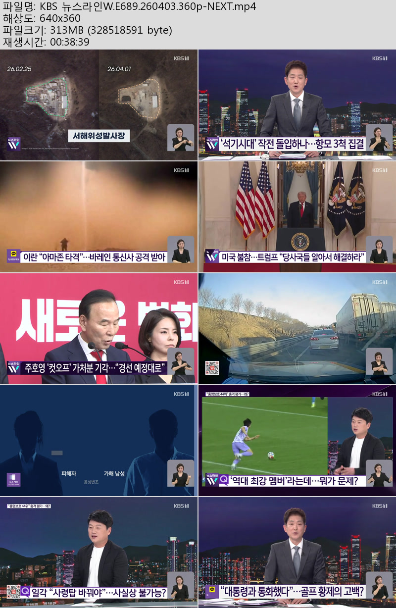 방송/동영상 KBS 뉴스라인W E689 KBS 뉴스라인W.E689.260403.360p-NEXT 우야쓰꼬 2026.04.24 5,047 313.3M 다운로드 1개 파일 KBS 뉴스라인W.E689.260403.360p-NEXT.mp4 313.3M 다운 추천 259 북마크 공유 목록 Tags KBS 뉴스라인W E689 NEXT