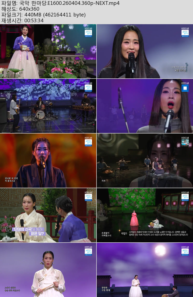 방송/동영상 국악 한마당 E1600 국악 한마당.E1600.260404.360p-NEXT 우야쓰꼬 2026.04.24 4,596 440.8M 다운로드 1개 파일 국악 한마당.E1600.260404.360p-NEXT.mp4 440.8M 다운 추천 268 북마크 공유 목록 Tags 국악 한마당 E1600 NEXT