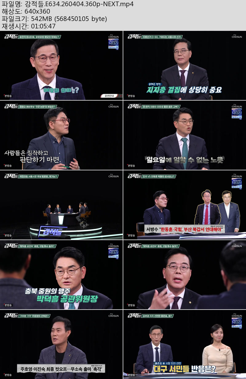 방송/동영상 강적들 E634 NEXT 강적들.E634.260404.360p-NEXT 우야쓰꼬 2026.04.24 6,277 542.1M 다운로드 1개 파일 강적들.E634.260404.360p-NEXT.mp4 542.1M 다운 추천 273 북마크 공유 목록 Tags 강적들 E634 NEXT