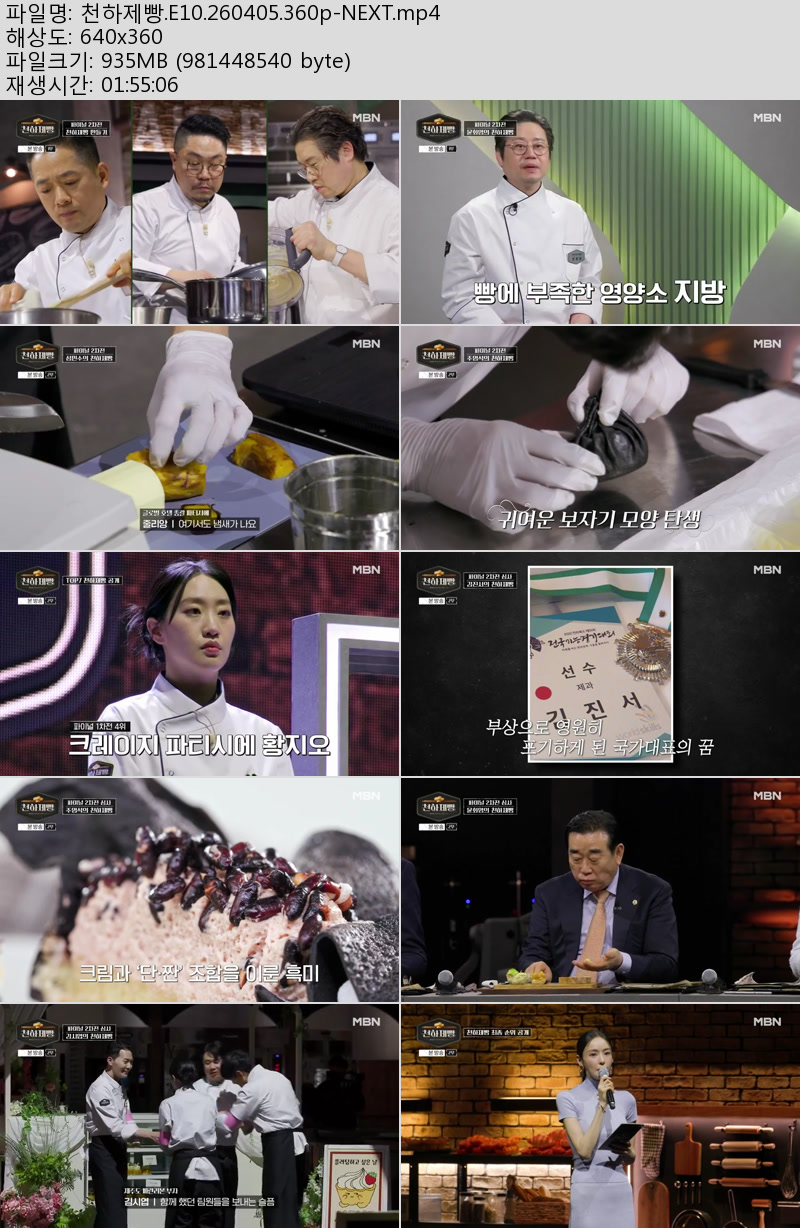 방송/동영상 천하제빵 E10 NEXT 천하제빵.E10.260405.360p-NEXT 우야쓰꼬 2026.04.24 5,960 936.0M 다운로드 1개 파일 천하제빵.E10.260405.360p-NEXT.mp4 936.0M 다운 추천 277 북마크 공유 목록 Tags 천하제빵 E10 NEXT