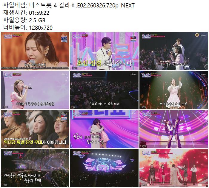 방송/동영상 미스트롯 갈라쇼 E02 미스트롯 4 갈라쇼.E02.260326.720p-NEXT zndhkgkgk 2026.04.24 3,007 2.5G 다운로드 1개 파일 미스트롯 4 갈라쇼.E02.260326.720p-NEXT.mp4 2.5G 다운 추천 480 북마크 공유 목록 Tags 미스트롯 갈라쇼 E02 NEXT