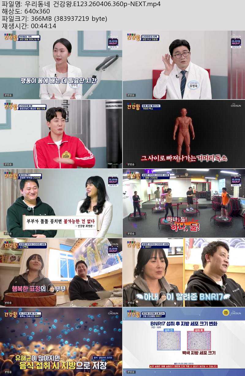 방송/동영상 우리동네 건강왕 E123 우리동네 건강왕.E123.260406.360p-NEXT 우야쓰꼬 2026.04.24 6,346 366.2M 다운로드 1개 파일 우리동네 건강왕.E123.260406.360p-NEXT.mp4 366.2M 다운 추천 431 북마크 공유 목록 Tags 우리동네 건강왕 E123 NEXT