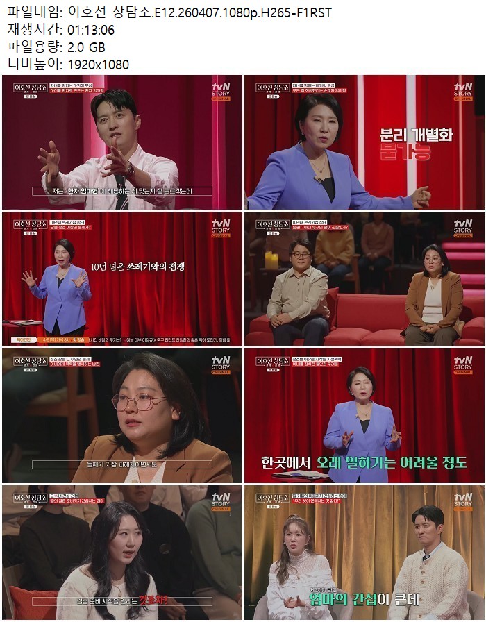 방송/동영상 이호선 상담소 E12 이호선 상담소.E12.260407.1080p.H265 디스사랑 2026.04.24 4,779 2.0G 다운로드 1개 파일 이호선 상담소.E12.260407.1080p.H265-F1RST.mp4 2.0G 다운 추천 268 북마크 공유 목록 Tags 이호선 상담소 E12 H265 F1RST