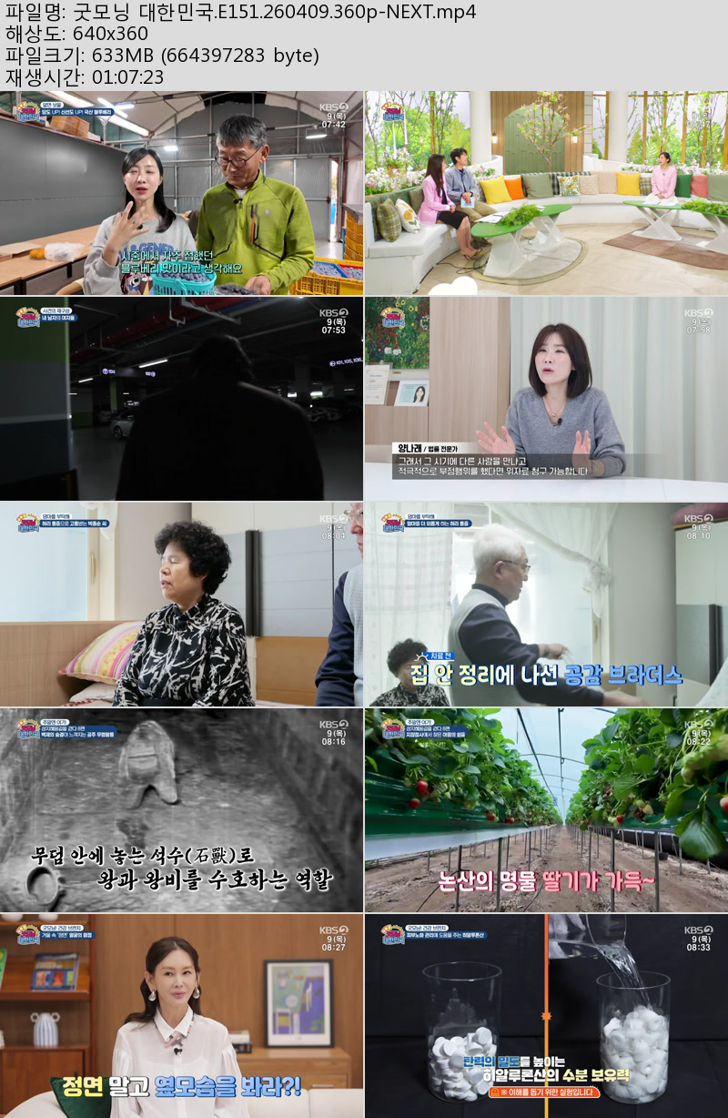 방송/동영상 굿모닝 대한민국 E151 굿모닝 대한민국.E151.260409.360p-NEXT 우야쓰꼬 2026.04.24 4,385 633.6M 다운로드 1개 파일 굿모닝 대한민국.E151.260409.360p-NEXT.mp4 633.6M 다운 추천 317 북마크 공유 목록 Tags 굿모닝 대한민국 E151 NEXT