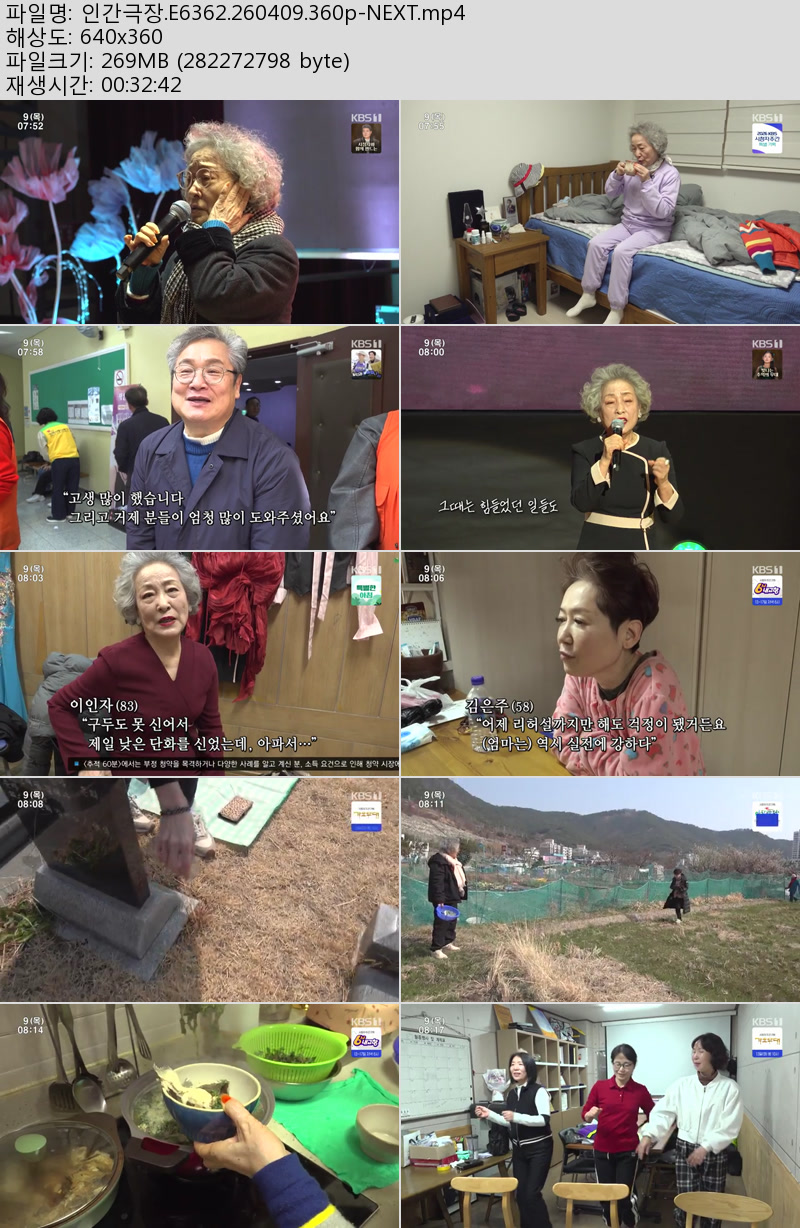 방송/동영상 인간극장 E6362 NEXT 인간극장.E6362.260409.360p-NEXT 우야쓰꼬 2026.04.24 5,373 269.2M 다운로드 1개 파일 인간극장.E6362.260409.360p-NEXT.mp4 269.2M 다운 추천 209 북마크 공유 목록 Tags 인간극장 E6362 NEXT