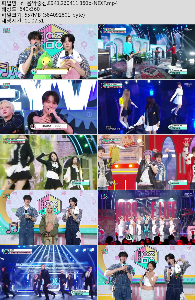 방송/동영상 음악중심 E941 NEXT 쇼 음악중심.E941.260411.360p-NEXT 우야쓰꼬 2026.04.24 5,841 557.0M 다운로드 1개 파일 쇼 음악중심.E941.260411.360p-NEXT.mp4 557.0M 다운 추천 326 북마크 공유 목록 Tags 음악중심 E941 NEXT