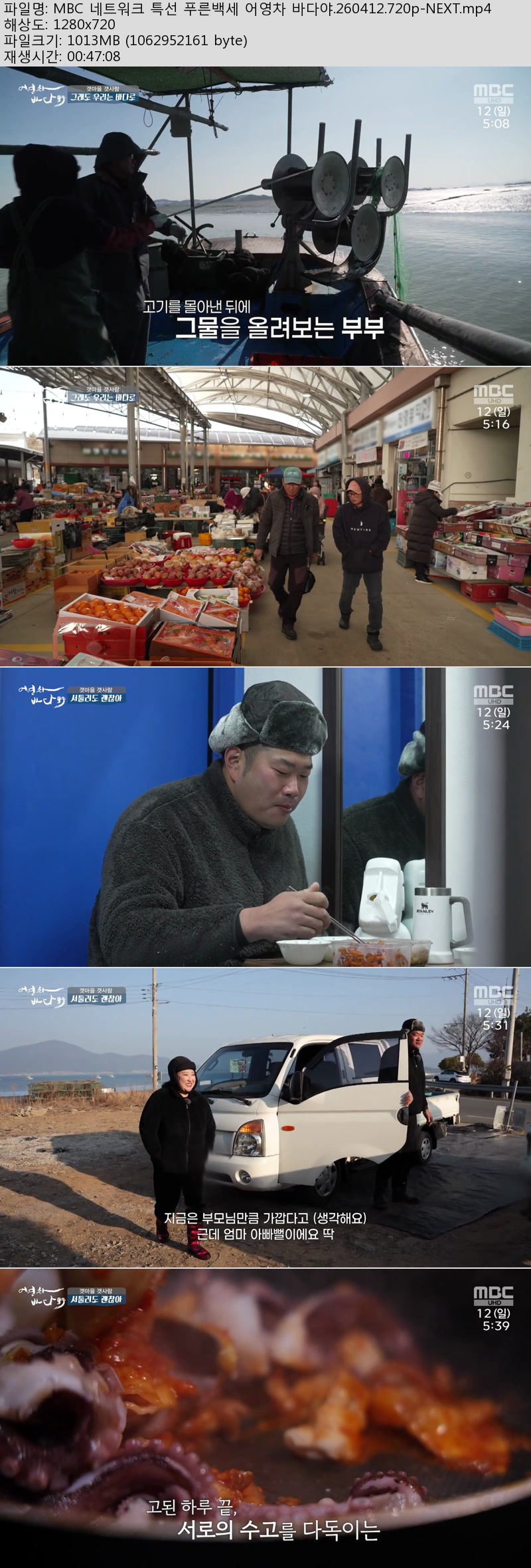 방송/동영상 MBC 네트워크 특선 MBC 네트워크 특선 푸른백세 어영차 바다야.260412.720p-NEXT 방송다좋아 2026.04.24 7,933 1,013.7M 다운로드 1개 파일 MBC 네트워크 특선 푸른백세 어영차 바다야.260412.720p-NEXT.mp4 1,013.7M 다운 추천 329 북마크 공유 목록 Tags MBC 네트워크 특선 푸른백세 어영차