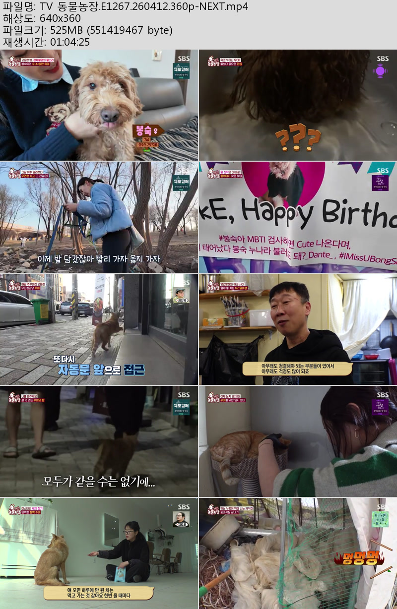 방송/동영상 TV 동물농장 E1267 TV 동물농장.E1267.260412.360p-NEXT 우야쓰꼬 2026.04.24 4,014 525.9M 다운로드 1개 파일 TV 동물농장.E1267.260412.360p-NEXT.mp4 525.9M 다운 추천 270 북마크 공유 목록 Tags TV 동물농장 E1267 NEXT