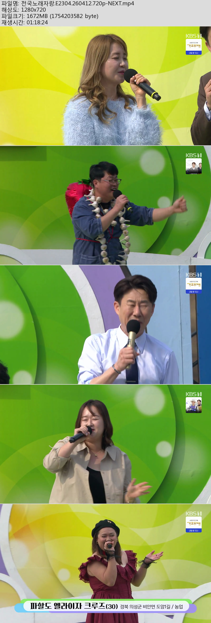 방송/동영상 전국노래자랑 E2304 NEXT 전국노래자랑.E2304.260412.720p-NEXT 방송다좋아 2026.04.24 4,957 1.6G 다운로드 1개 파일 전국노래자랑.E2304.260412.720p-NEXT.mp4 1.6G 다운 추천 275 북마크 공유 목록 Tags 전국노래자랑 E2304 NEXT