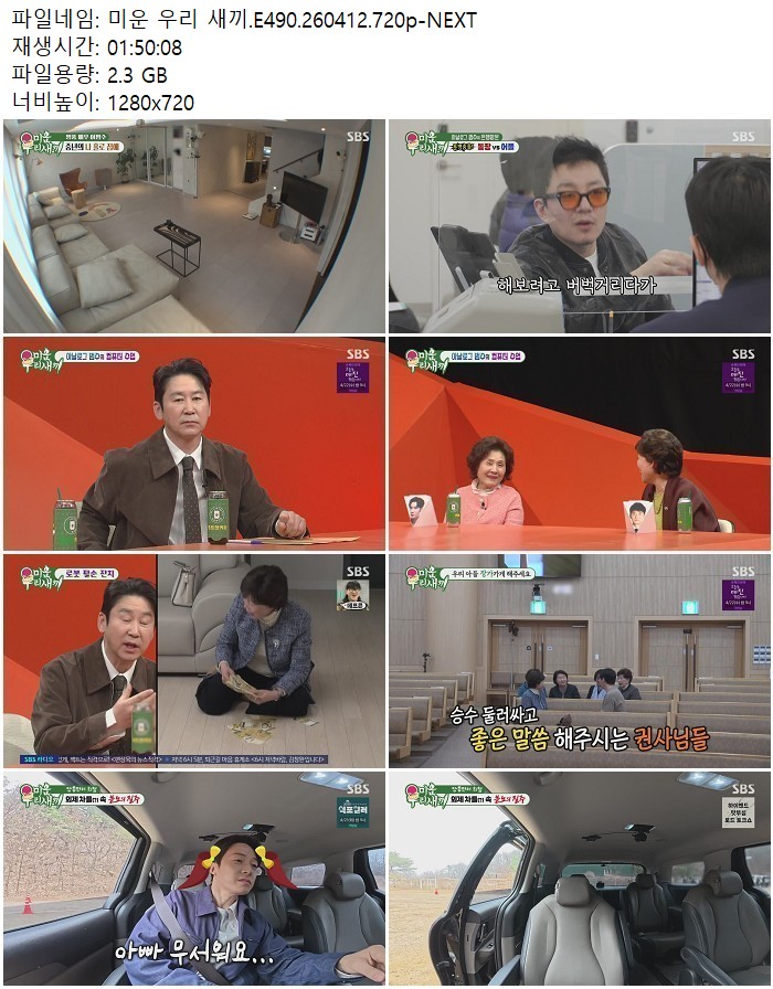 방송/동영상 미운 우리 새끼 미운 우리 새끼.E490.260412.720p-NEXT 디스사랑 2026.04.24 3,311 2.3G 다운로드 1개 파일 미운 우리 새끼.E490.260412.720p-NEXT.mp4 2.3G 다운 추천 473 북마크 공유 목록 Tags 미운 우리 새끼 E490 NEXT
