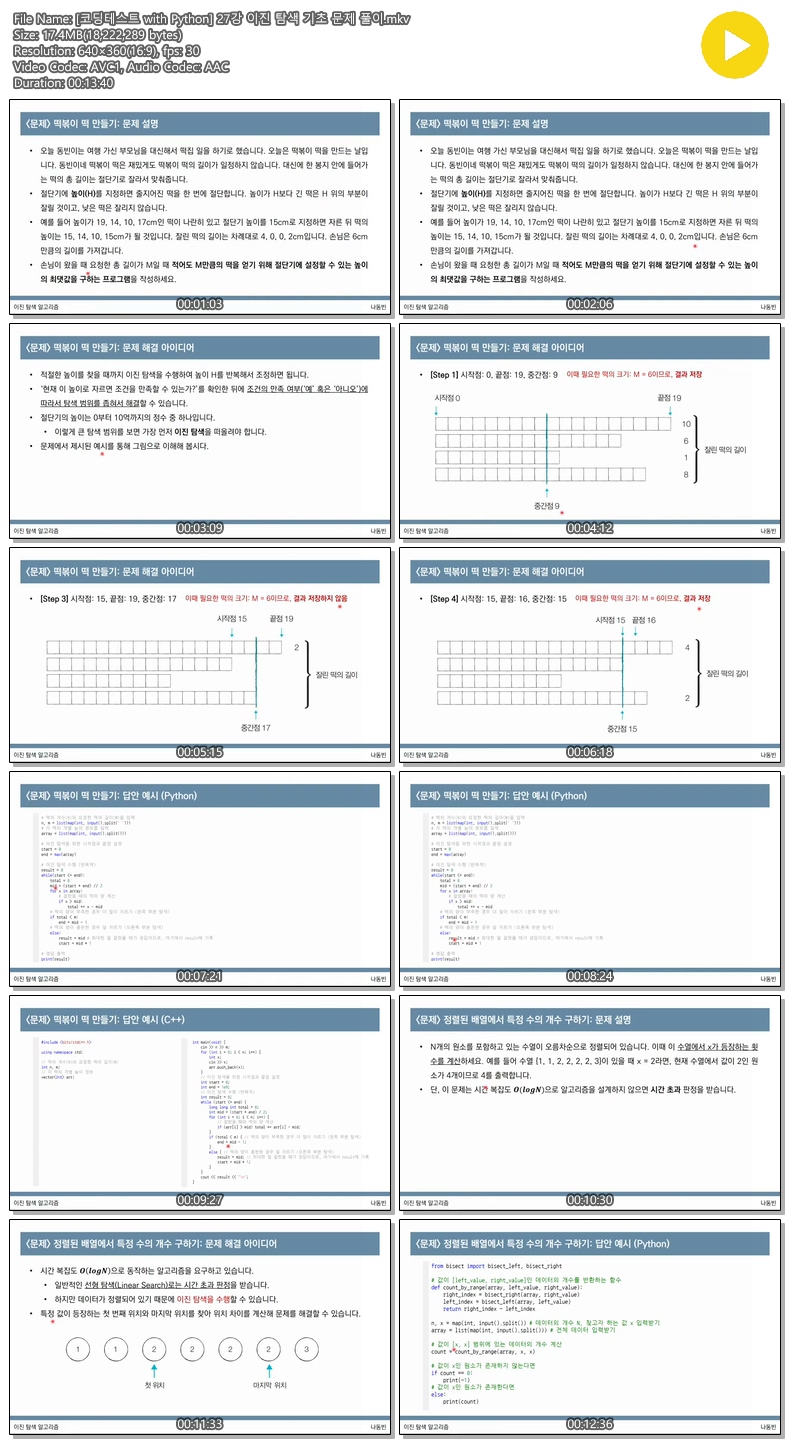 교육 코딩테스트 with Python [코딩테스트 with Python] 27강 이진 탐색 기초 문제 풀이 jibori 2026.04.24 6,606 17.4M 다운로드 1개 파일 [코딩테스트 with Python] 27강 이진 탐색 기초 문제 풀이.mkv 17.4M 다운 추천 326 북마크 공유 목록 Tags 코딩테스트 with Python 27강 이진