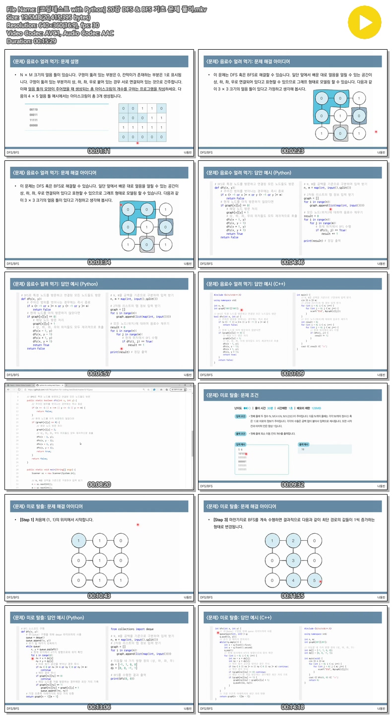 교육 코딩테스트 with Python [코딩테스트 with Python] 20강 DFS & BFS 기초 문제 풀이 jibori 2026.04.24 7,385 19.5M 다운로드 1개 파일 [코딩테스트 with Python] 20강 DFS & BFS 기초 문제 풀이.mkv 19.5M 다운 추천 259 북마크 공유 목록 Tags 코딩테스트 with Python 20강 DFS