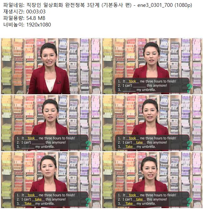 교육 직장인 일상회화 완전정복 직장인 일상회화 완전정복 3단계 (기본동사 편) - ene3_0301_700 (.. 쿠무 2026.04.24 6,684 54.8M 다운로드 1개 파일 직장인 일상회화 완전정복 3단계 (기본동사 편) - ene3_0301_700 (1080p).. 54.8M 다운 추천 483 북마크 공유 목록 Tags 직장인 일상회화 완전정복 3단계 기본동사