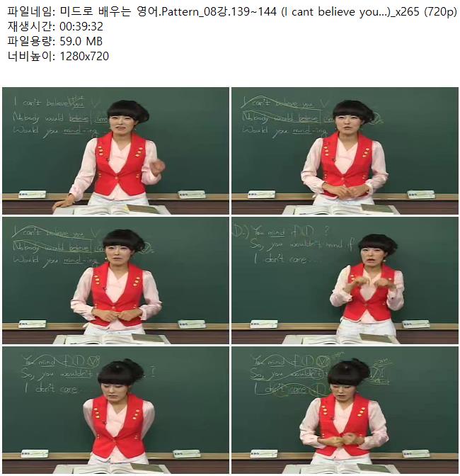 교육 미드로 배우는 영어 미드로 배우는 영어.Pattern_08강.139~144 (I cant believe you…)_.. 쿠무 2026.04.24 6,767 59.0M 다운로드 1개 파일 미드로 배우는 영어.Pattern_08강.139~144 (I cant believe you…)_x265 (.. 59.0M 다운 추천 287 북마크 공유 목록 Tags 미드로 배우는 영어 Pattern 08강