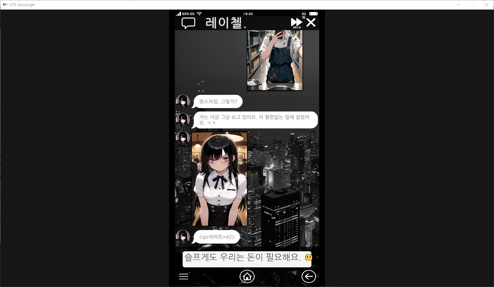 NTR 메신저는 메신저 스타일의 인터페이스를 기반으로 하는 NTR/부패 게임입니다. 플레이어의 선택에 따라 스토리의 방향이