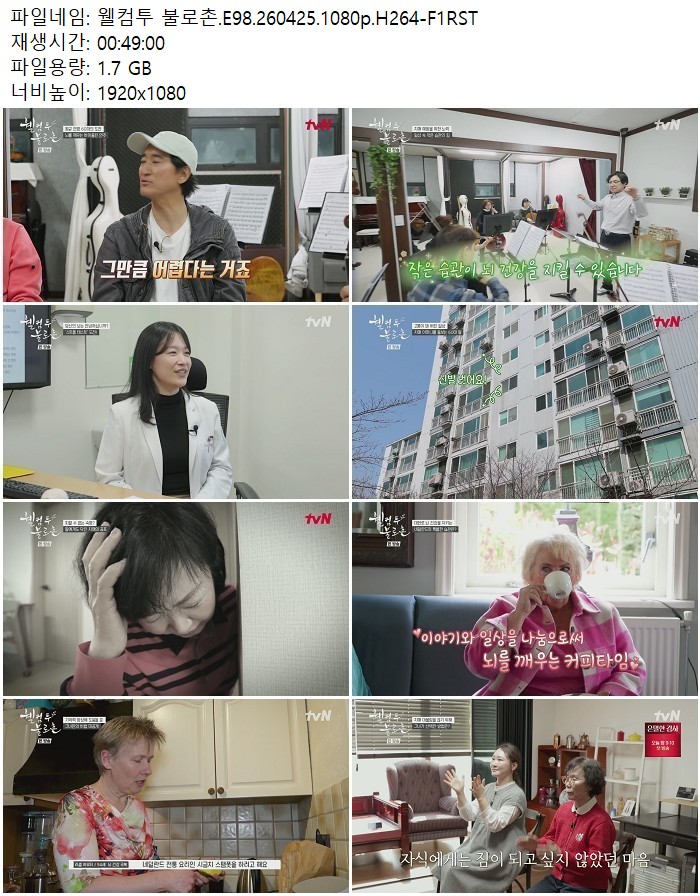방송/동영상 웰컴투 불로촌 E98 웰컴투 불로촌.E98.260425.1080p.H264 디스사랑 2026.04.27 4,109 1.7G 다운로드 1개 파일 웰컴투 불로촌.E98.260425.1080p.H264-F1RST.mp4 1.7G 다운 추천 278 북마크 공유 목록 Tags 웰컴투 불로촌 E98 H264 F1RST