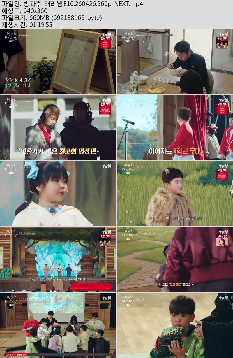방송/동영상 방과후 태리쌤 E10 방과후 태리쌤.E10.260426.360p-NEXT 우야쓰꼬 2026.04.27 7,209 660.1M 다운로드 1개 파일 방과후 태리쌤.E10.260426.360p-NEXT.mp4 660.1M 다운 추천 220 북마크 공유 목록 Tags 방과후 태리쌤 E10 NEXT