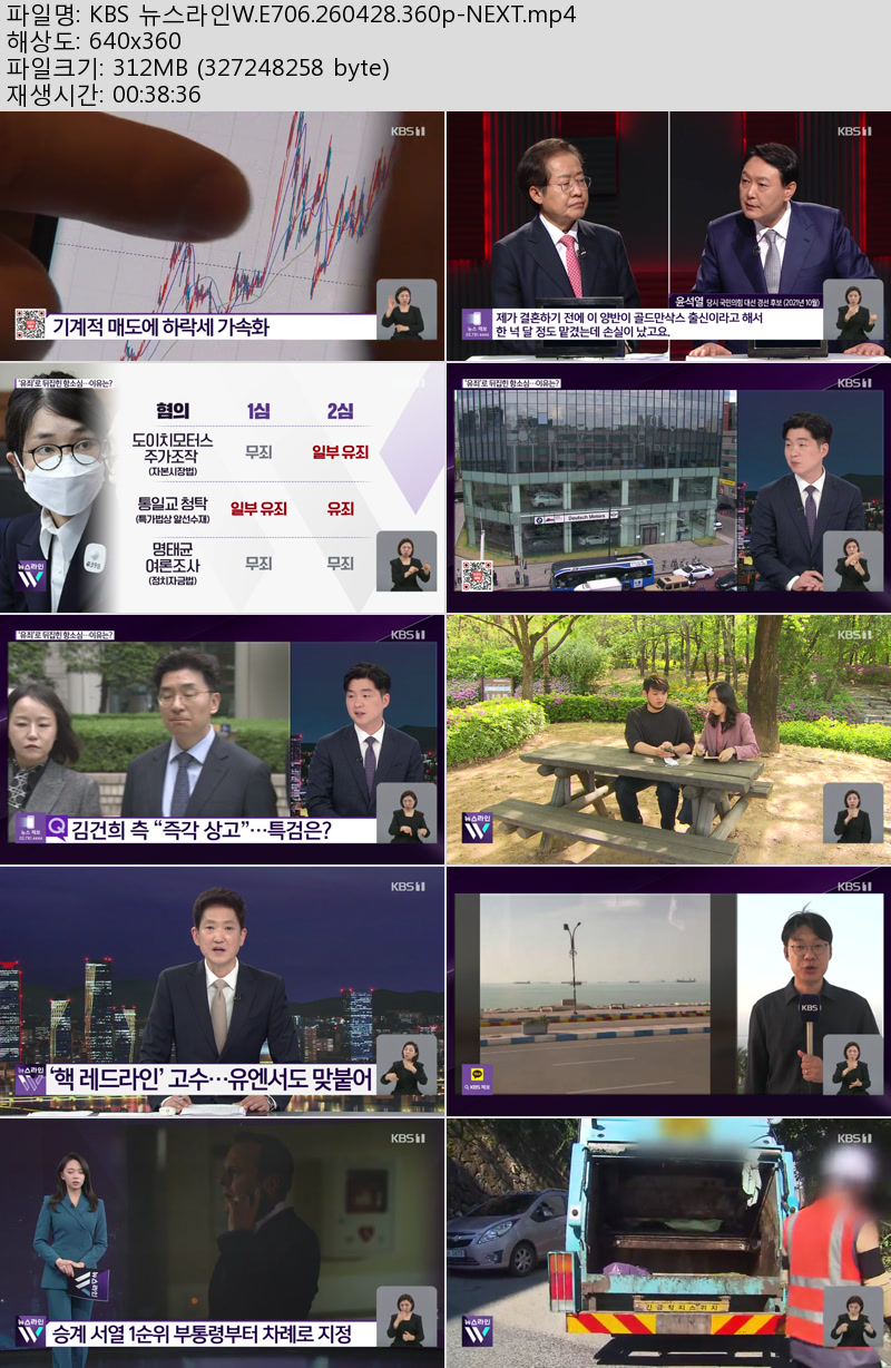 방송/동영상 KBS 뉴스라인W E706 KBS 뉴스라인W.E706.260428.360p-NEXT 우야쓰꼬 2026.04.29 7,885 312.1M 다운로드 1개 파일 KBS 뉴스라인W.E706.260428.360p-NEXT.mp4 312.1M 다운 추천 286 북마크 공유 목록 Tags KBS 뉴스라인W E706 NEXT