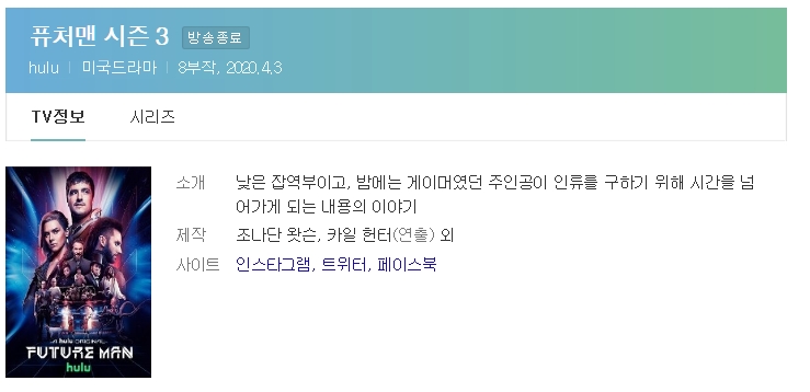 드라마 퓨처맨 Future Man 퓨처맨(Future Man) 시즌3 01화-08화.완결 vandals 2026.01.01 3,281 6.5G 퓨처맨(Future Man) 시즌3 01화-08화.완결퓨처맨(Future Man) 시즌3 01화-08화.완결 다운로드 1개 파일 Future.Man.S03E01.1080p..HULU.WEBRip.DDP5.1.x264-NT… 6.5G 다운 추천 618 북마크 공유 목록 Tags 퓨처맨 Future Man 시즌3 01화 08화 완결